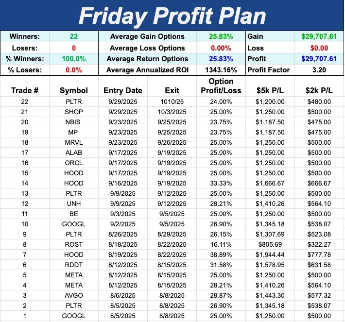 **We develop tools and strategies to the best of our ability, but no one can guarantee the future. There is always a risk of loss when trading. Past performance is not indicative of future results. Stated results are from live published alerts between 8/5/25 and 10/26/25. The win rate has been 100% on the options with an average return of 26% over a 3 Day hold time.